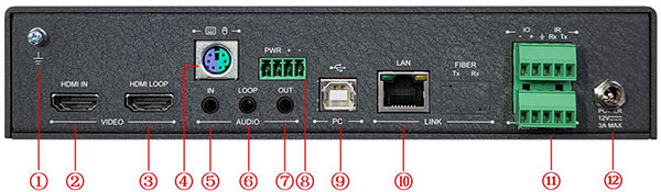 | (1) 接地接口 | (2) HDMI(4K)視頻輸入 | (3) HDMI(4K)視頻環出 |